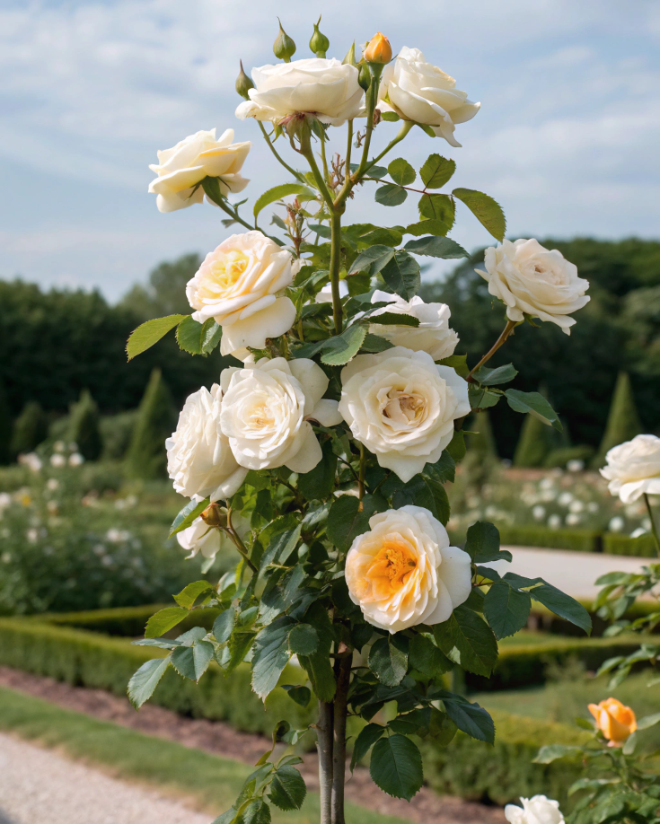 Оқ-крем рангли атиргул, марказида алтингсимон жилоси билан. Француз услубидаги нафосат. Бозордаги энг қимматбаҳо дарахтсимон навлардан бири.Спросить ChatGPT
